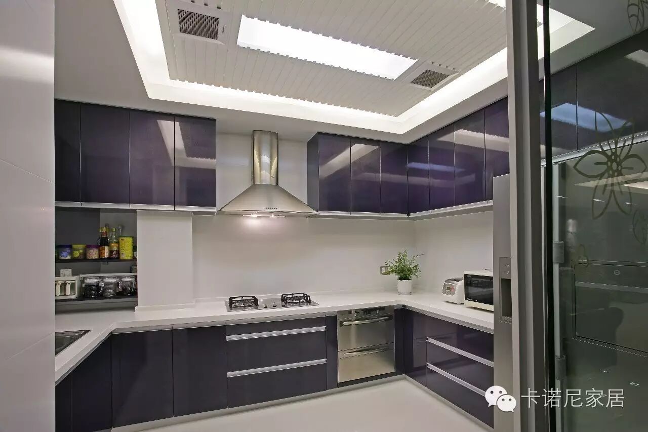 厨房是烹调制作食品的场所,也是最易脏的地方。现代居室的厨房应是一个洁净明亮的空间环境,色彩应以表现清洁、卫生为主。室内的温度也由于烹调而变高,颜色的选择一般采用较白或较冷色系列,缓和室内热量。地面不宜过浅,可采用深灰等耐污性好的颜色,墙面宜以白色为主,便于清洁整理,顶部宜采用浅灰、浅黄等颜色。故常用白色、灰色,再点缀上黄、橙、红、蓝、绿等欢快、阳光的色彩,使主妇有一种温暖清爽的心理感受。